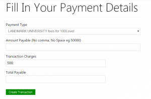 - Fill the Amount Payable without comma and space(s) e.g. 50000 and then Click “create Transaction” Button.